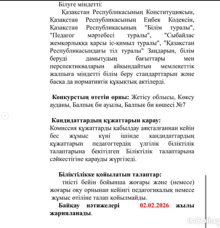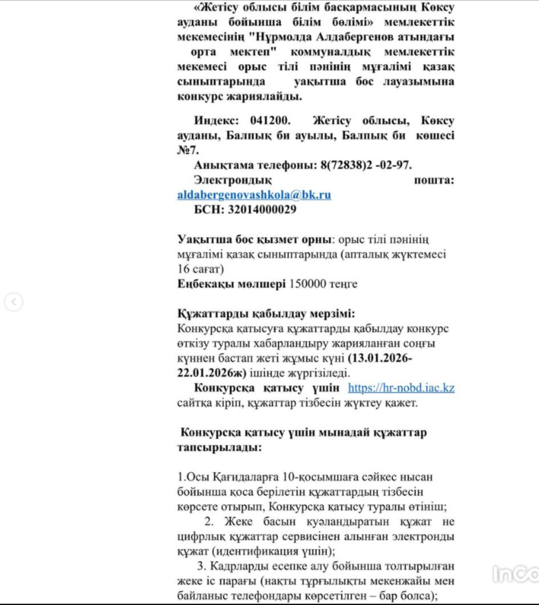 Внимание вакансия » Жетісу облысы Көксу ауданы Н.Алдабергенов атындағы орта мектеп