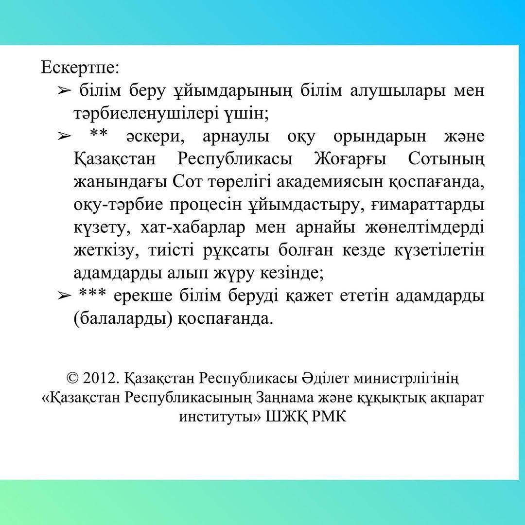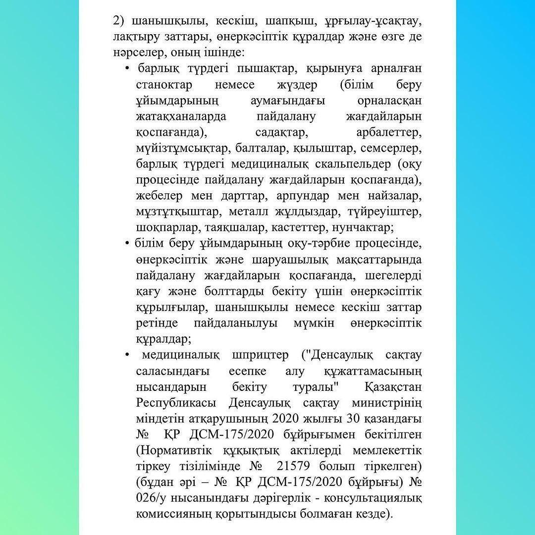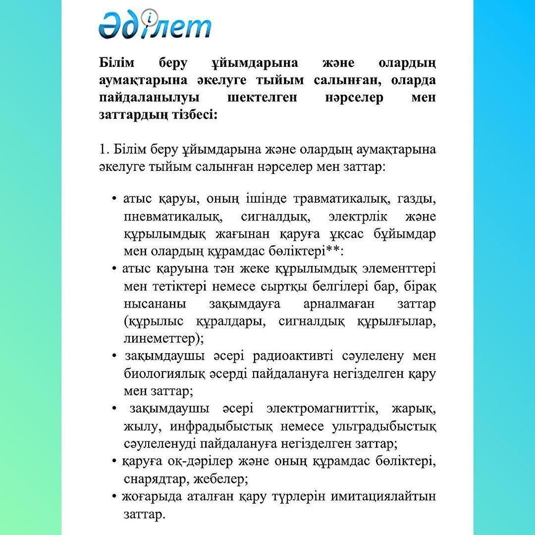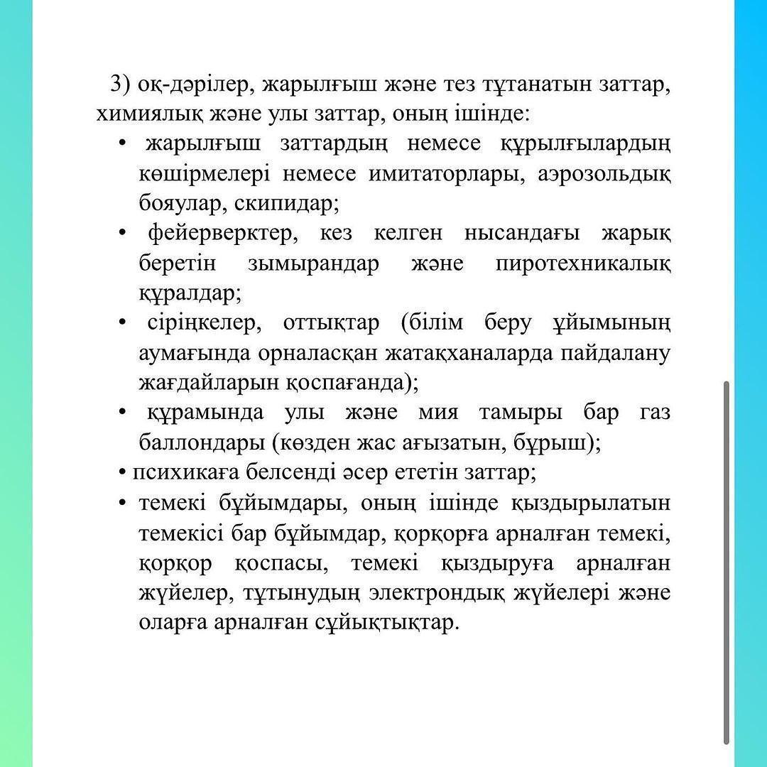 03 февраль 2023 0 1 2 3 4 5 Білім беру ұйымдарына және оның аумақтарына әкелуге тыйым салынған,оларда пайдалануы шектелген нәрселер мен заттарды Білім беру ұйымдарына және оның аумақтарына әкелуге тыйым салынған,оларда пайдалануы шектелген нәрселер мен заттарды