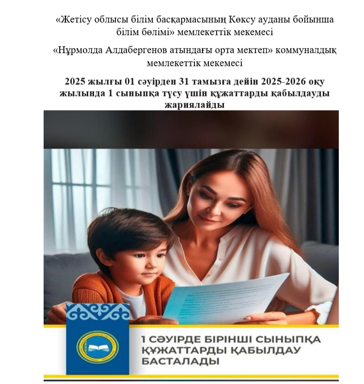 Құрметті ата-аналар, ұстаздар, балалар, ағымдағы жылғы 1 сәуірден бастап 2024-2025 оқу жылына 1 сыныпқа құжат қабылдау басталады! » Жетісу облысы Көксу ауданы Н.Алдабергенов атындағы орта мектеп