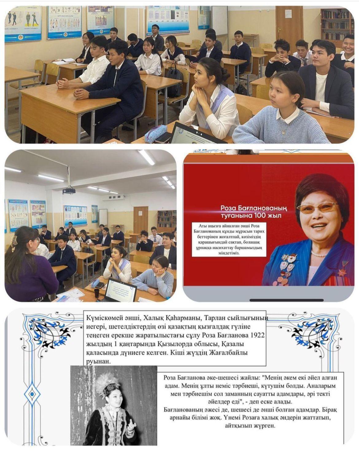 өзін-өзі басқару ұйымының мүшелерінің жұмыс жоспарына сәйкес «Роза Бағлановаға-100 жыл» тақырыбында сынып сағаты өтілді.Мақсаты: Әнші Роза Бағланова туралы, оның өнердегі қоғамда алған орны туралы оқушыларға мағлұмат беру; Аты аңызға айналып, ерлік істері барша ұлтты таң қалдырып, есімі тарих беттерінде алтын әріппен өрнектелген қазақтың әнші қызы арқылы үлгі етіп, өнеге ету; Жас жеткіншек ұрпақтарды Отансүйгіштікке, ерлікке, адалдыққа баулу. Ұлттық патриоттық сезімін қалыптастыру; елін, жерін қорғауға, бейбітшілікті нығайтуға тәрбиелеу,өнерге баулу ,табиғатқа деген сүйіспеншіліктерін нығайту. Оқушыларды музыка мәдениетін құрметтеуге тәрбиелеу; Қазақ музыкасын дәріптеу, жастарға халқымыздың мақтанышына айналған халық әншілерін насихаттау, олардың өнердегі жолын үлгі ету.