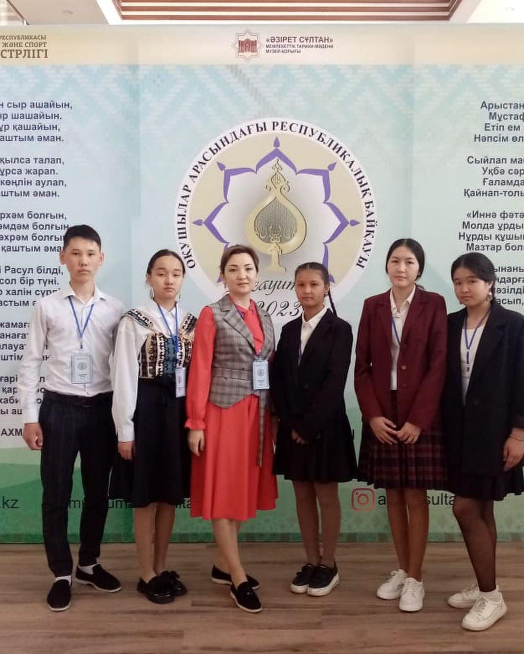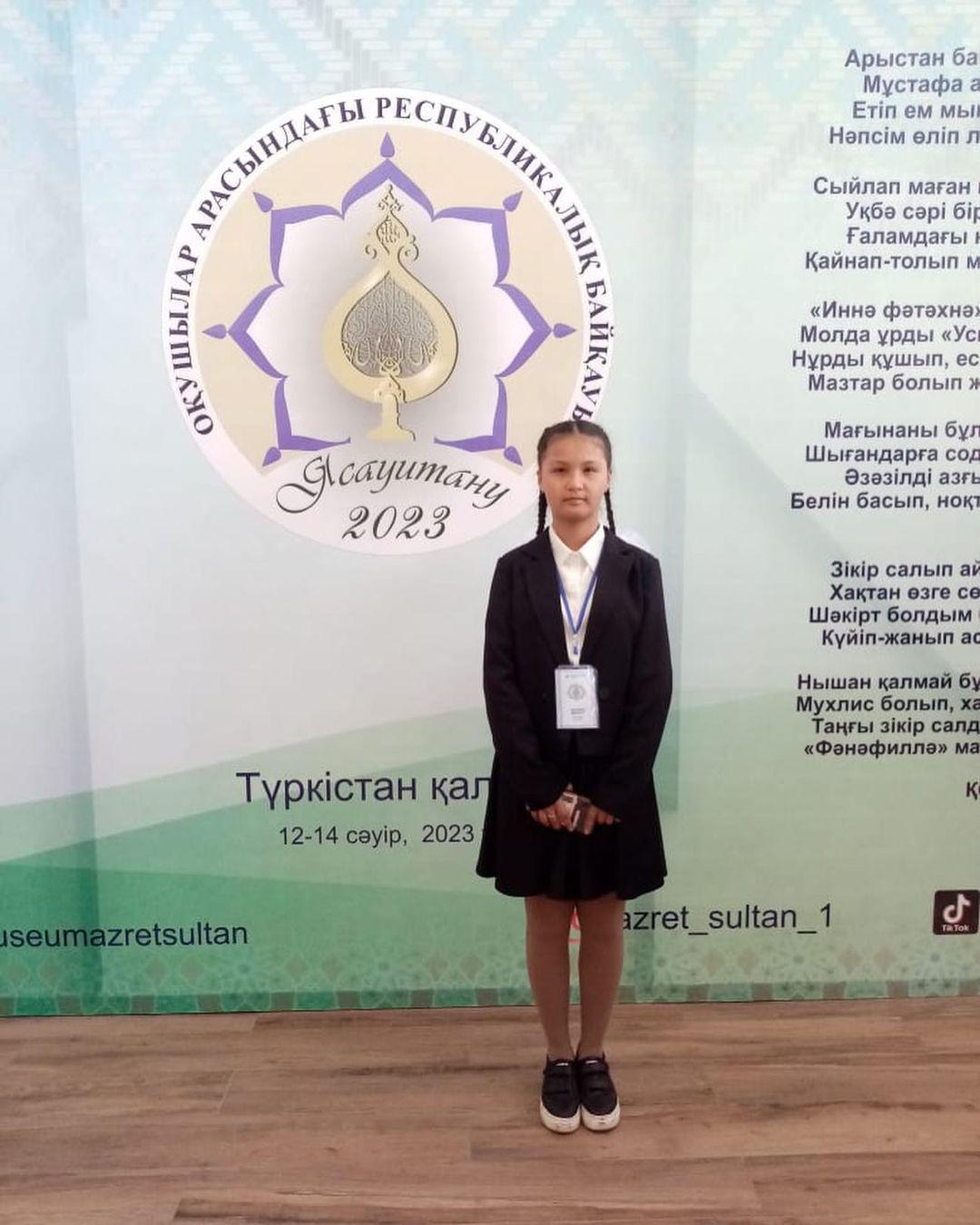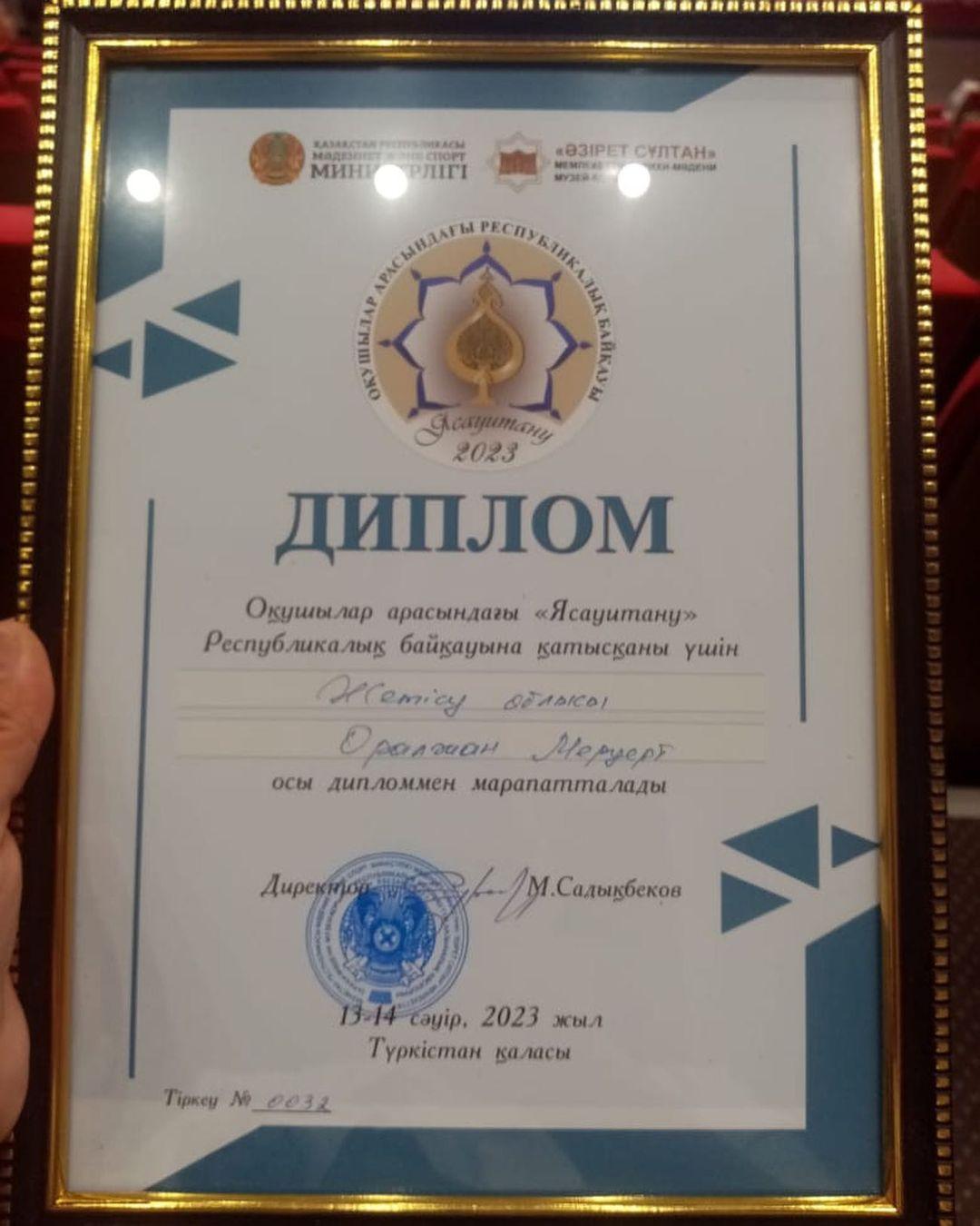 2023ж сәуір айының 13-14 күндері аралығында Түркістан қаласында өткен оқушылар арасындағы "Ясауитану" Республикалық байқауына қатысып 9 "А" сынып оқушысы Оралжан Меруерт қатысқаны үшін дипломмен марапатталды.