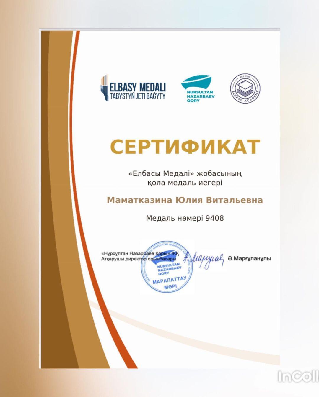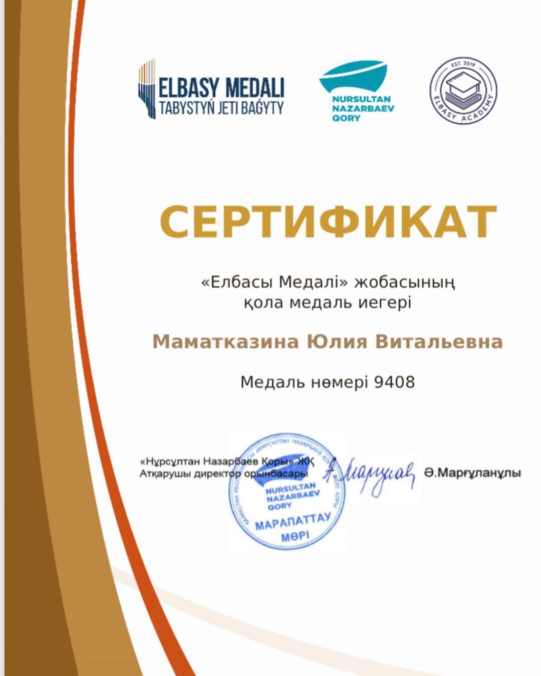 Оқушы жетістігі әрқашан ұстазын қуанышқа, шаттыққа бөлейді. Өнерде де, білімде де, спортта да биік белестерден көрініп жүрген оқушылар жетерлік. Солардың бірі, мектебіміздің 11”В” сынып оқушысы - Маматказина Юлия. Ол мектеп қабырғасында жүріп, көптеген жетістіктері үшін “Елбасы медалімен” марапатталды