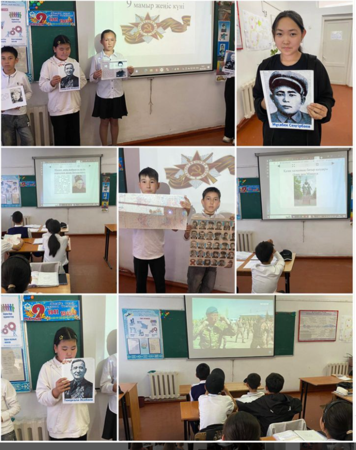 9 мамыр – Жеңіс күніне орай 6 “А” сыныбында сынып сағаты өткізілді. Оқушыларға Ұлы Отанды сүюге, Отанын, елін қорғай білуге тәрбиелеу және ерлік көрсеткен батырлардың бойындағы ержүректілік, отансүйгіштік, ұлтжандылық қасиеттерін дәріптеу мақсатында » Жетісу облысы Көксу ауданы Н.Алдабергенов атындағы орта мектеп
