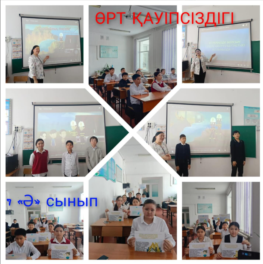 7 «Ә» сыныбында «Өрт қауіпсіздігі» тақырыбында бірыңғай сынып сағаты өткізілді. Мақсаты: Балаларға өрт қауіпсіздігі ережелерін қайталап түсіндіріп, білімдерін дамыту. Тілсіз жау бола қалған жағдайда өздерін қорғай білуге дағдыландыру. Сабақ барысында » Жетісу облысы Көксу ауданы Н.Алдабергенов атындағы орта мектеп
