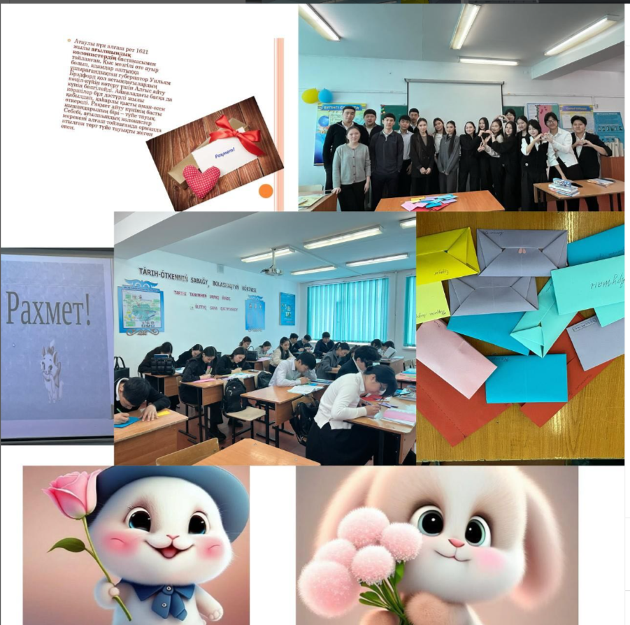 27 ақпан күні 11 «А» сыныбында Алғыс айту күніне байланысты «Алғыс айту парызым» атты тақырыпта сынып сағаты өткізілді. Тәрбиеленушілердің жанұяға, ата - анаға, үлкен - кішіге деген сүйіспеншілігін, сыпайылық қарым - қатынастарын дамыту.Ризашылық пен алғыс, жақсы тілек, ізеттілік туралы түсінік беру, бір - бірімен үйлесімді қарым - қатынас жасай білуге үйрету.Елімізде тұрып жатқан әр түрлі ұлттар мен ұлыстардың арасындағы достық пен ынтымақтастықты дәріптеу, салт - дәстүрін, мәдениетін өзіндік үлгі өнегесін оқушылардың бойына сіңіру. Бейбітшілікте татулықта өмір сүруге тәрбиелеу. Оқушылар ата-аналарына арнап алғыс хаттарын жазып, тілектерін жолдады. Сынып жетекші Д.Г.Даирбекова