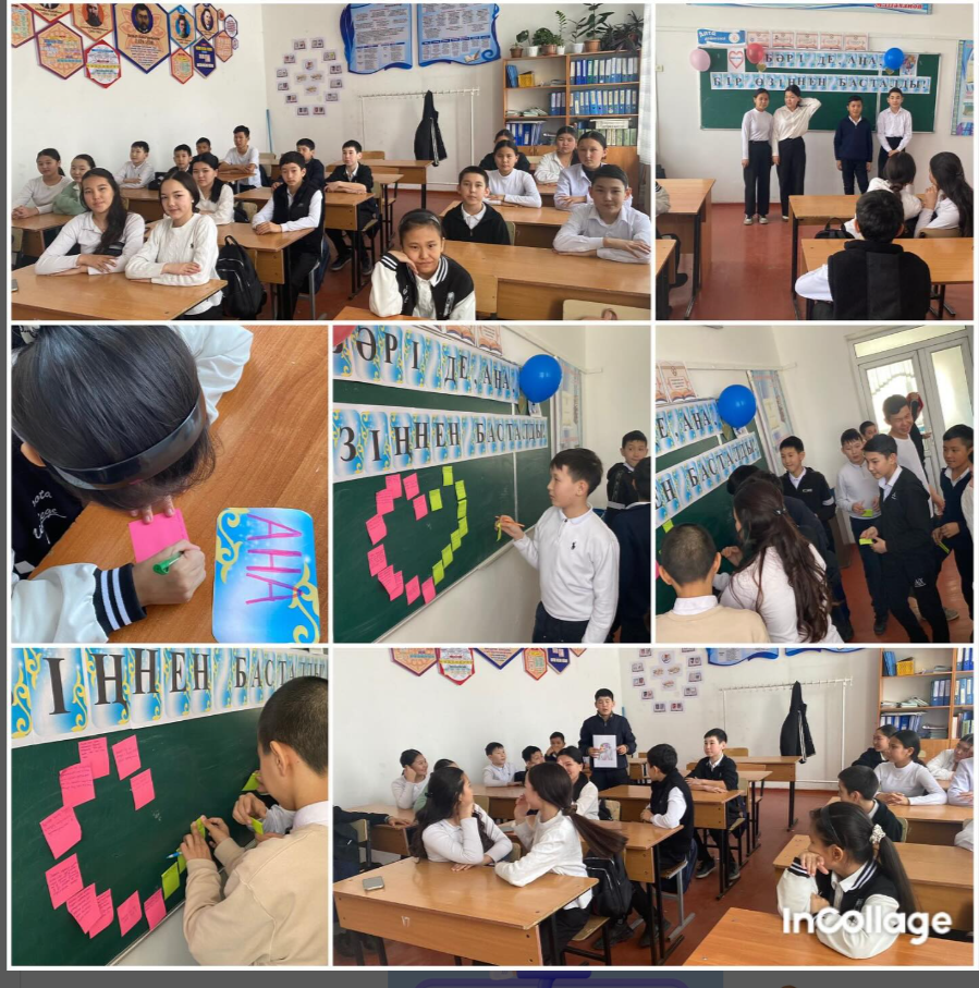 «Біртұтас тәрбие» бағдарламасына сәйкес 7А сынып оқушылары «Бәрі де, ана, бір өзіңнен басталды!» атты сынып сағатын өткізді. Ұлттық құндылықтар мен отбасы құндылықтары ұғымын оқушылардың бойына сіңіре отырып, қыздар мен ұлдардың арасындағы сыйластық пен құрметті нығайту және аналардың рөлін арттыру мақсатында өткізілген шараға оқушылар белсене қатысты.