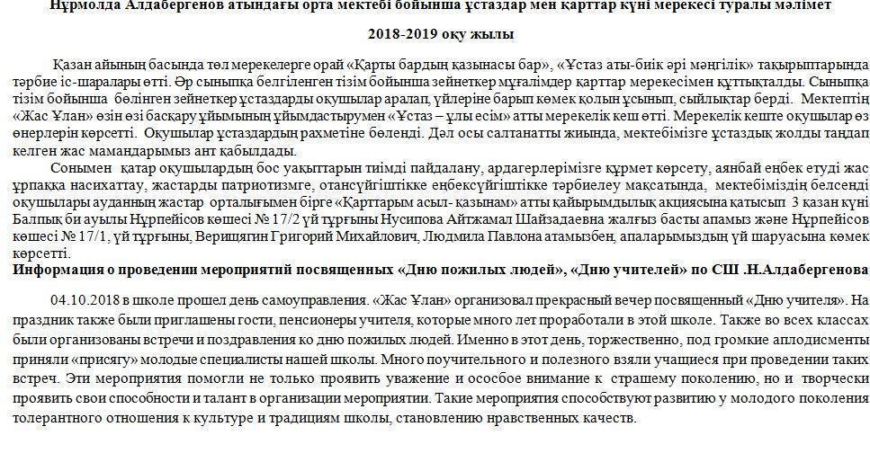 09 октябрь 2018 0 1 2 3 4 5 Нұрмолда Алдабергенов атындағы орта мектебі бойынша ұстаздар мен қарттар күні мерекесі туралы мәлімет 2018-2019 оқу жылы