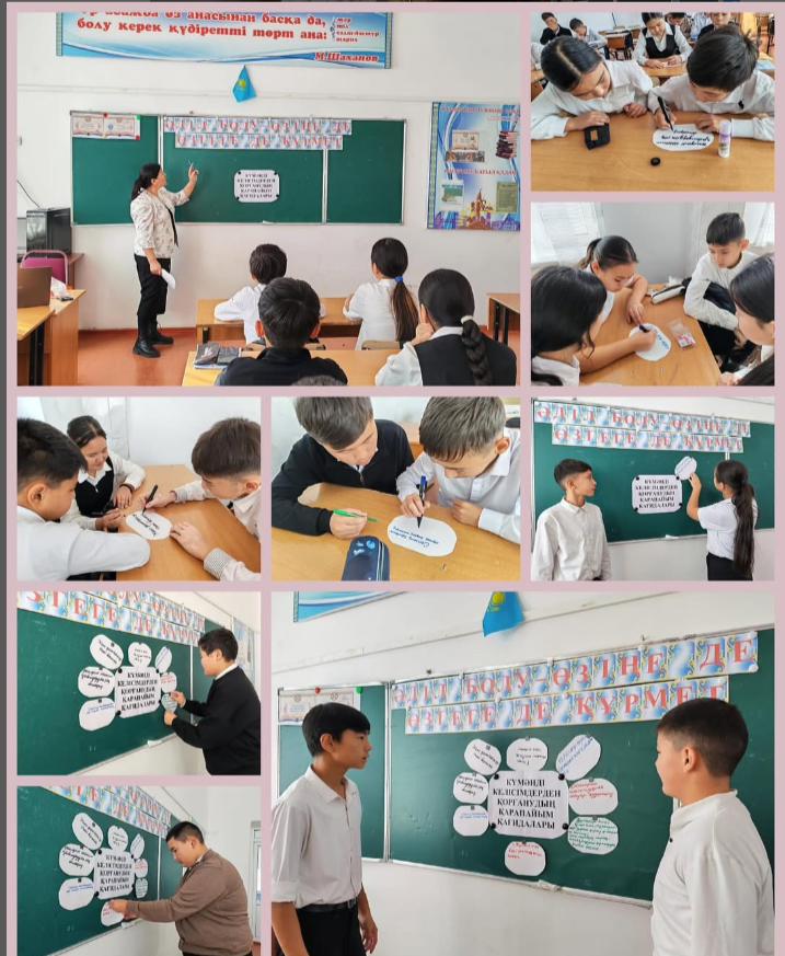 Сынып сағатында оқушылар әділ болу, шындықты айту, адамға, қоршаған ортаға қиянат жасамау, өзіне және өзгелерге құрметпен қарау жөнінде ойларын ортаға салып, өмірден мысалдар келтірді.