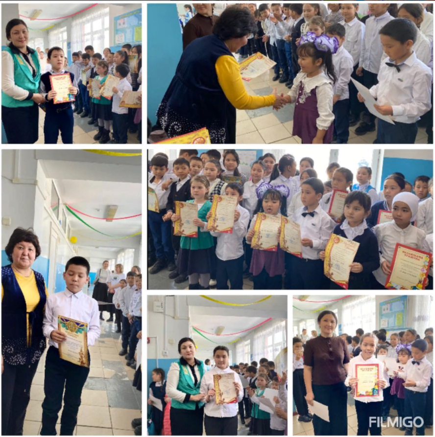 Нұрмолда Алдабергенов атындағы орта мектептің бастауыш сыныптардың “Бастауышым - бастамам, білім жолын бастаған” тақырыбымен өткен онкүндігінің аяқталуына байланысты саптүзеу өткізіліп, апталық аясында өткізілген іс-шараларға белсенді қатысқан оқушыл » Жетісу облысы Көксу ауданы Н.Алдабергенов атындағы орта мектеп
