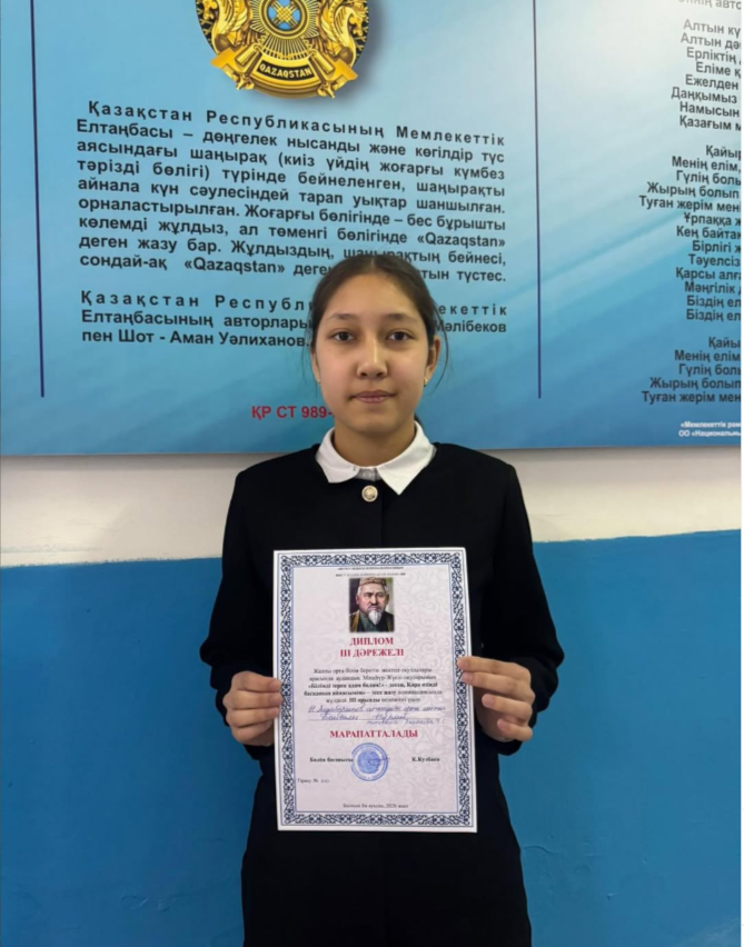 Жалпы ората білім беретін мектеп оқушылар арасында аудандық Мәшһүр Жүсіп оқуларының «білімді зерек адам болам!»-десең» қара өзіңді басқаның айнасымен»- эссе жазу номинациясында мектебіміздің 9 «А» сынып оқушысы Байғали Нұрай жүлделі 3 орынды иеленген