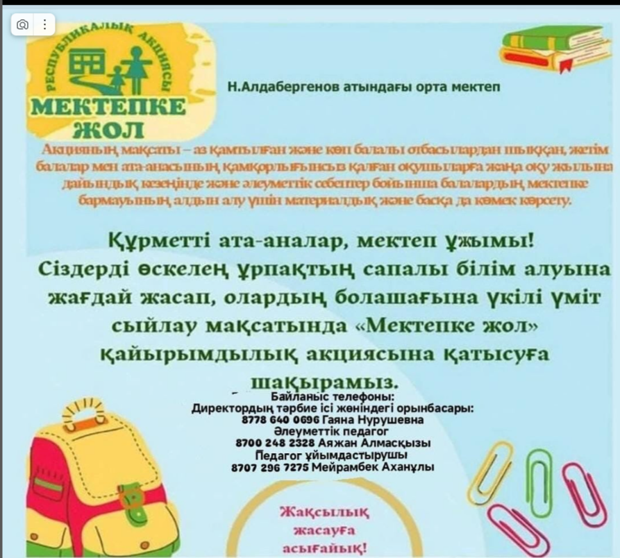 🔷 Құрметті облыс тұрғындары! «Мектепке жол» республикалық акциясын іске асыруға белсенді қатысуларыңызды сұраймыз.