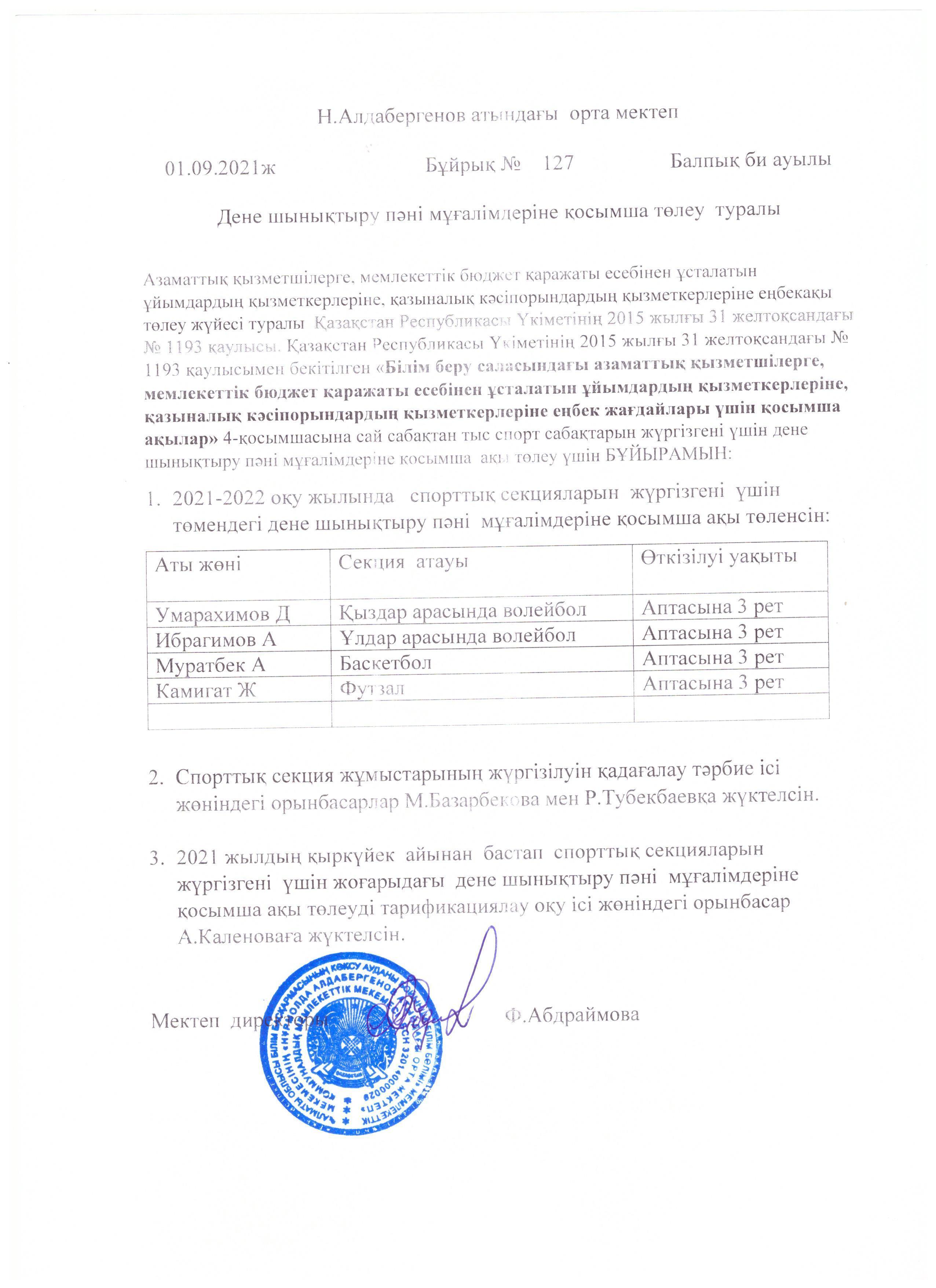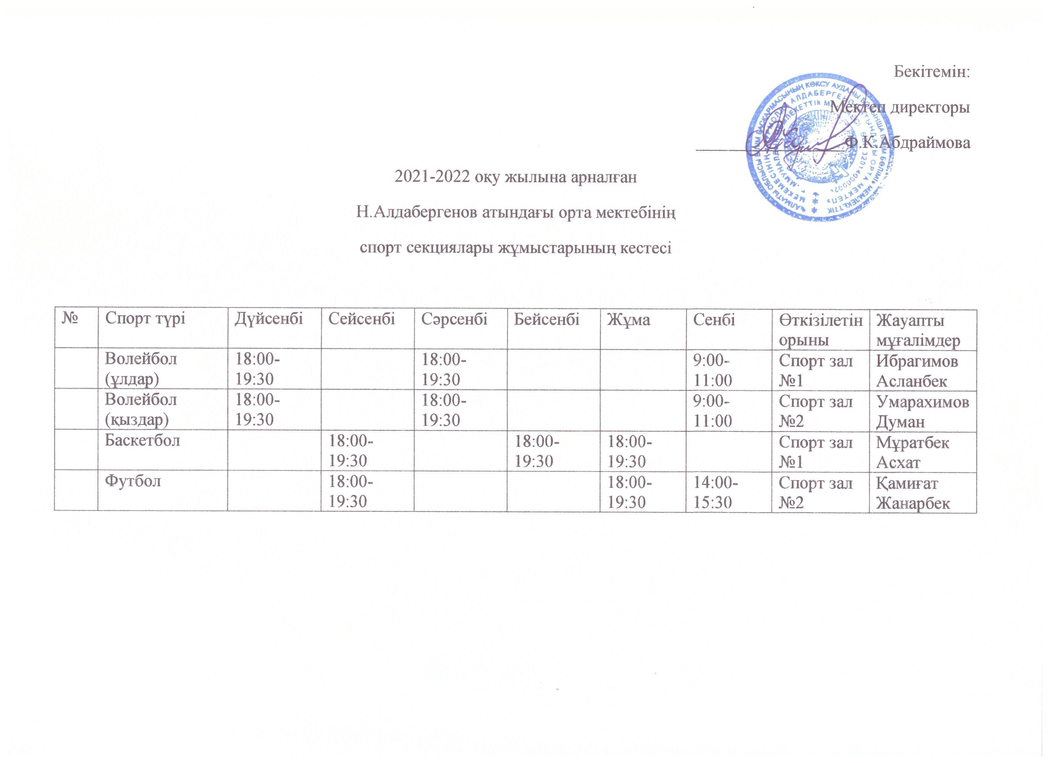 Расписание спортивных секций на 2021-2022 учебный год » Жетісу облысы Көксу ауданы Н.Алдабергенов атындағы орта мектеп